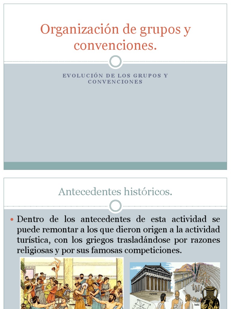 Organización de grupos y convenciones. EVOLUCIÓN DE LOS GRUPOS Y CONVENCIONES Antecedentes históricos. Dentro de los antecedentes de esta actividad se puede remontar a los que dieron origen a la actividad turística, con los griegos trasladándose por razones religiosas y por sus famosas competiciones. Antecedentes históricos El movimiento turístico fue mas importante con los romanos con.