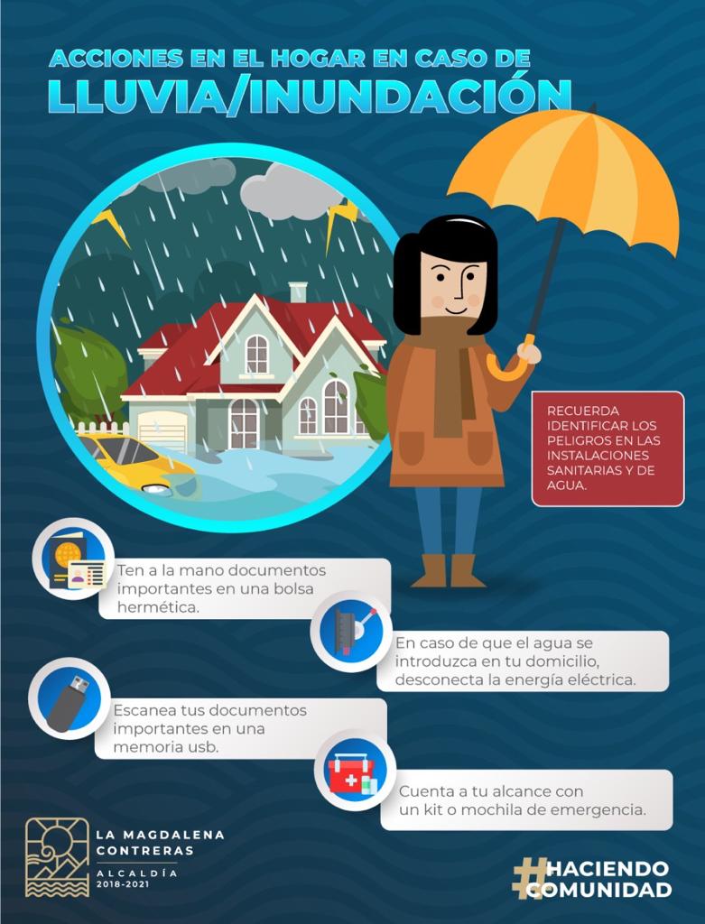 Desconectar aparatos eléctricos en caso de inundaciones por lluvias. Cerrar la llave de paso del agua y del gas para evitar daños en la infraestructura. Evitar estacionar vehículos en cauces de ríos. Alejarse de lugares que puedan derrumbarse o ser peligrosos durante una inundación.