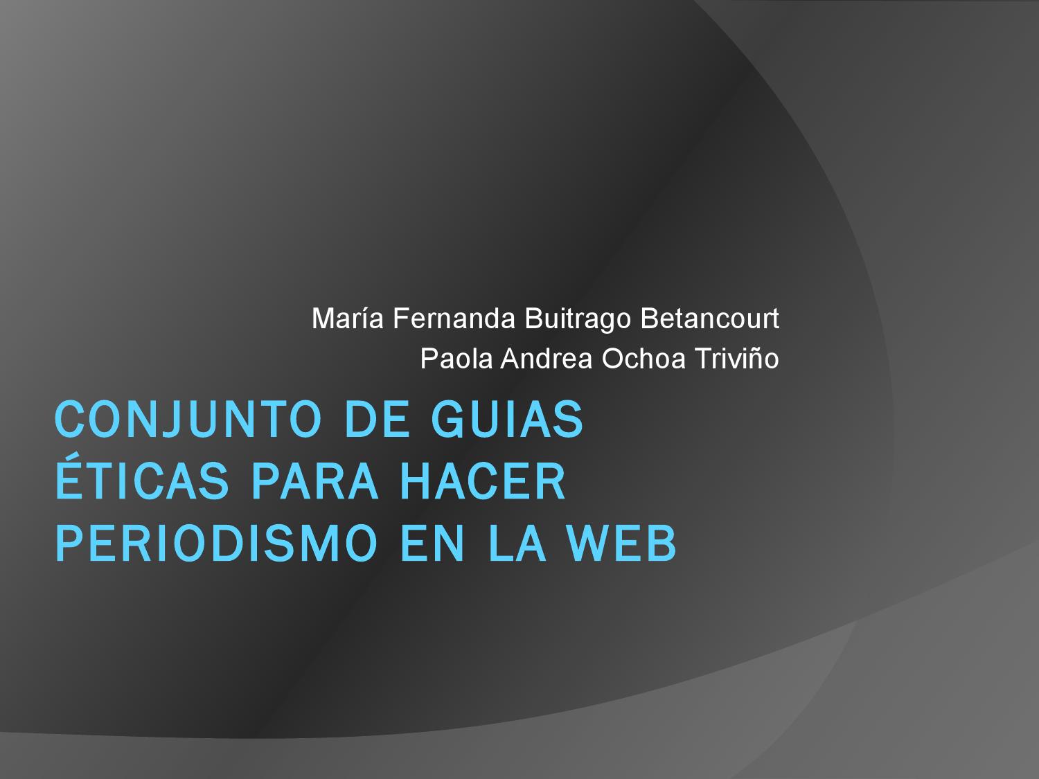 Title: conjunto de guías éticas para la Web , Author: Cindy Lorena Perdomo, Length: 2 pages, Published: 2013-11-29. Conjunto de guías éticas para hacer periodismo en la Web El cibermedio mantiene una confianza. La importancia en los cibermedios radica en el prestigio que tienen y en la credibilidad que el usuario deposita en ellos.