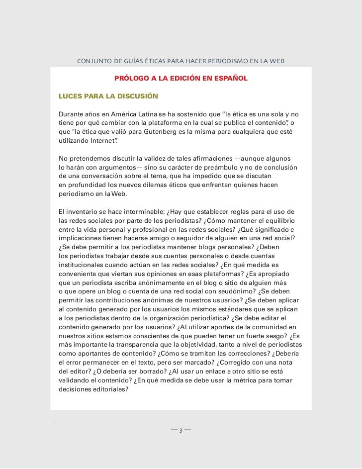 Conjunto de guías étiCas para haCer periodismo en la Web — 4 — Este documento (así como 'Las 10 mejores prácticas para redes sociales, directrices útiles para las organizaciones periodísticas', de James Hohmann y el Comité de Ética y Valores de ASNE —American Society of News Editors— 2010-