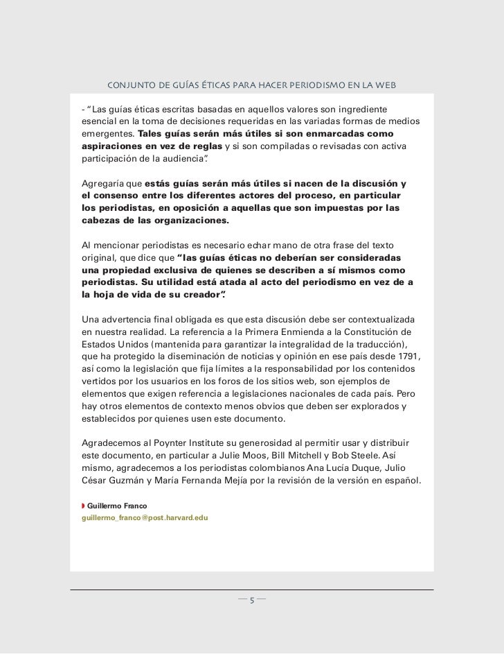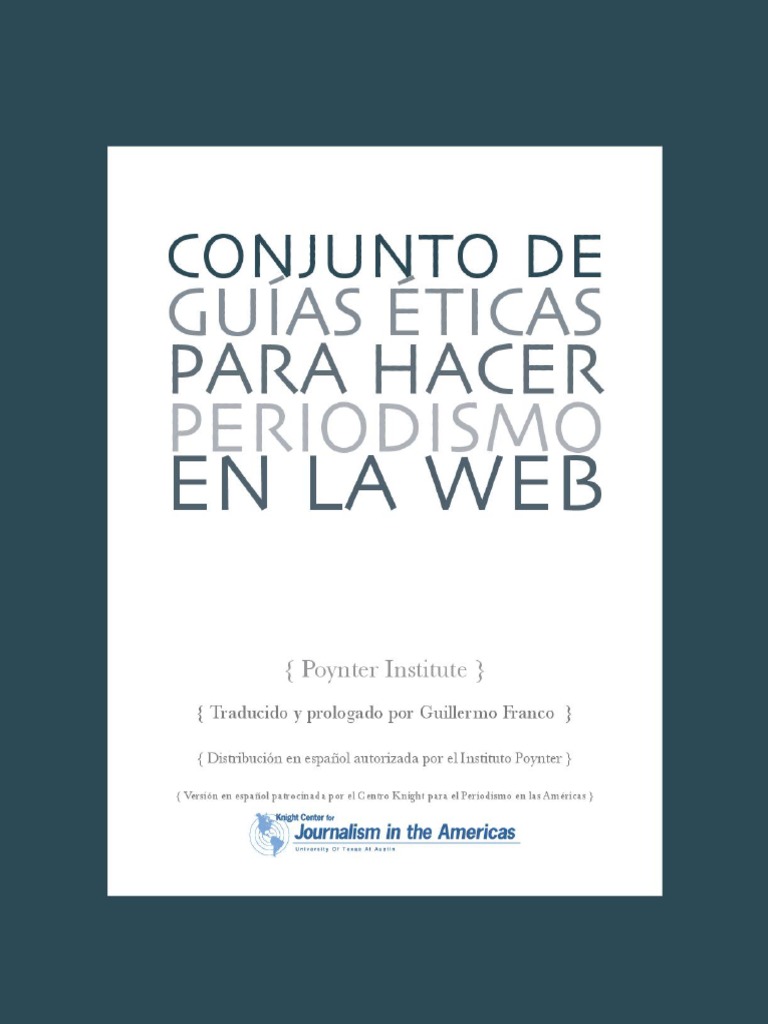 El Instituto Poynter, una escuela norteamericana dedicada a formar periodistas de calidad para fortalecer la democracia, ha publicado en alianza con el Centro Knight para Periodismo en las Américas de la Universidad de Texas, la traducción al español del libro Conjunto de guías éticas para hacer periodismo en la Web.. El libro, traducido al español por el periodista colombiano Guillermo.