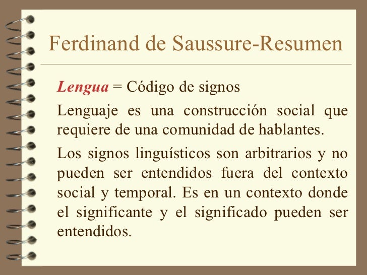 Saussure. Para Saussure el lenguaje es una capacidad humana universal para expresar pensamientos y sentimientos a través de los signos. El lenguaje es entendió como un objeto binario, tiene por un lado un componente social que es la lengua, y por otro lado un componente individual que es el habla. Para Saussure la lengua es un sistema de.