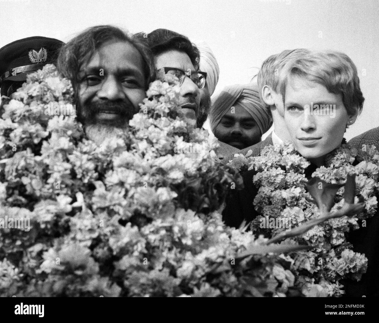 Maharishi Mahesh Yogi and American actress Mia Farrow, wife of Frank Sinatra, are seen garlanded