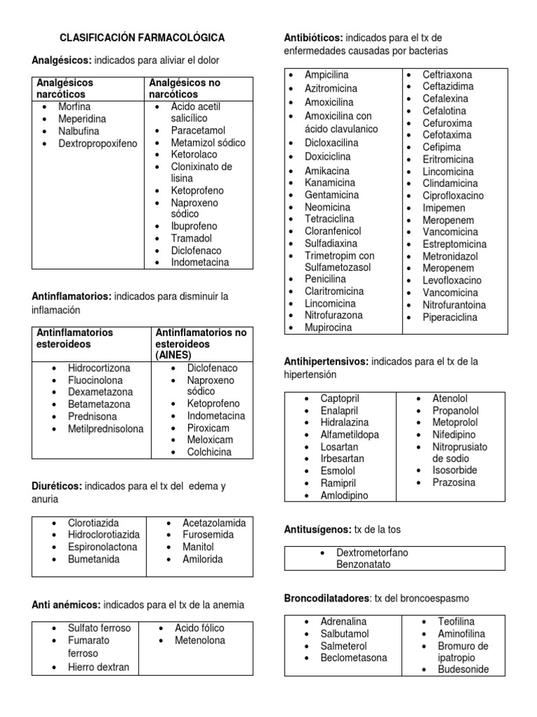 clasificacion de medicamentos por actividades farmacologicas