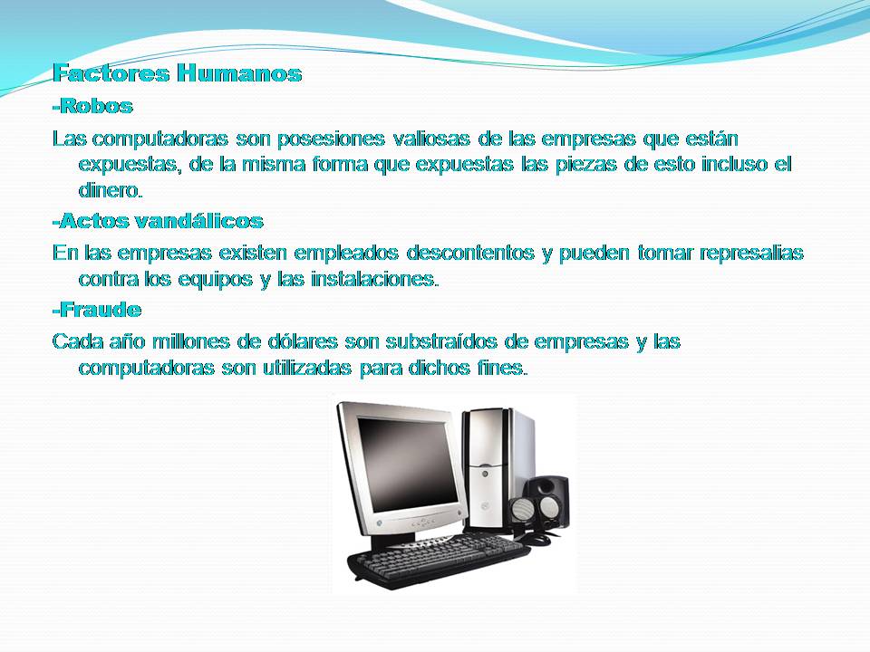 Los principales riesgos laborales que experimentan los trabajadores informáticos son: Fatiga visual o muscular. Golpes o caídas. Contacto eléctrico. Carga mental. Distintos factores en la organización. Para poder evitar o minimizar estos riesgos hay que tener en cuenta los siguientes factores: Adecuada organización en el trabajo.