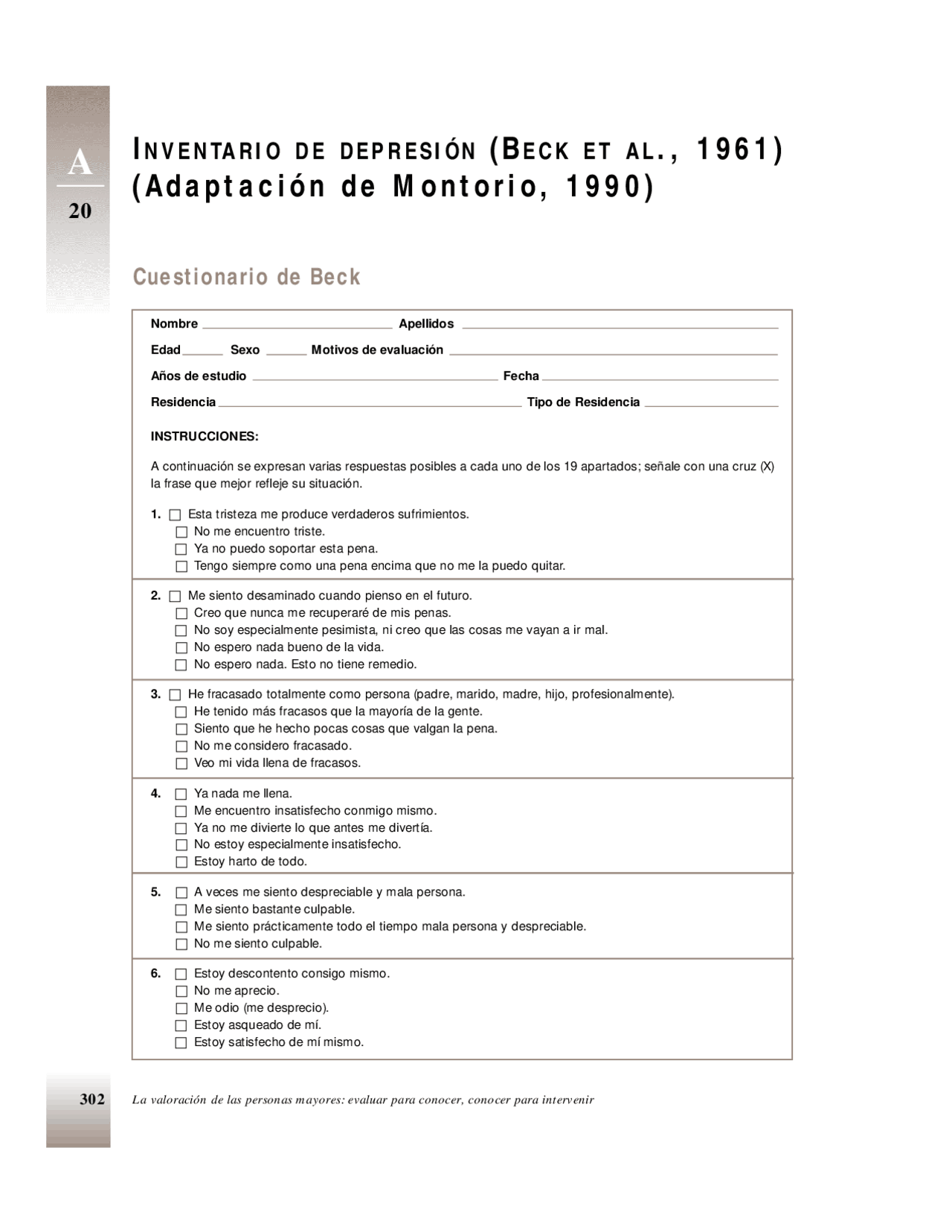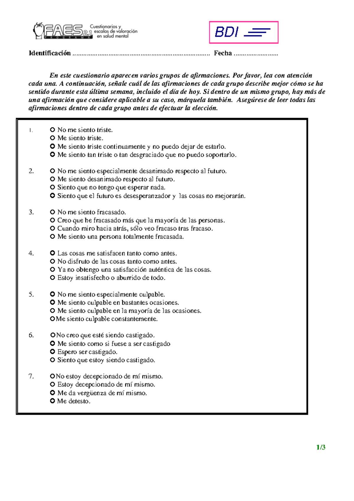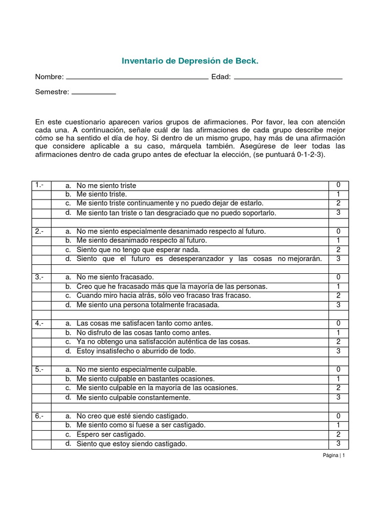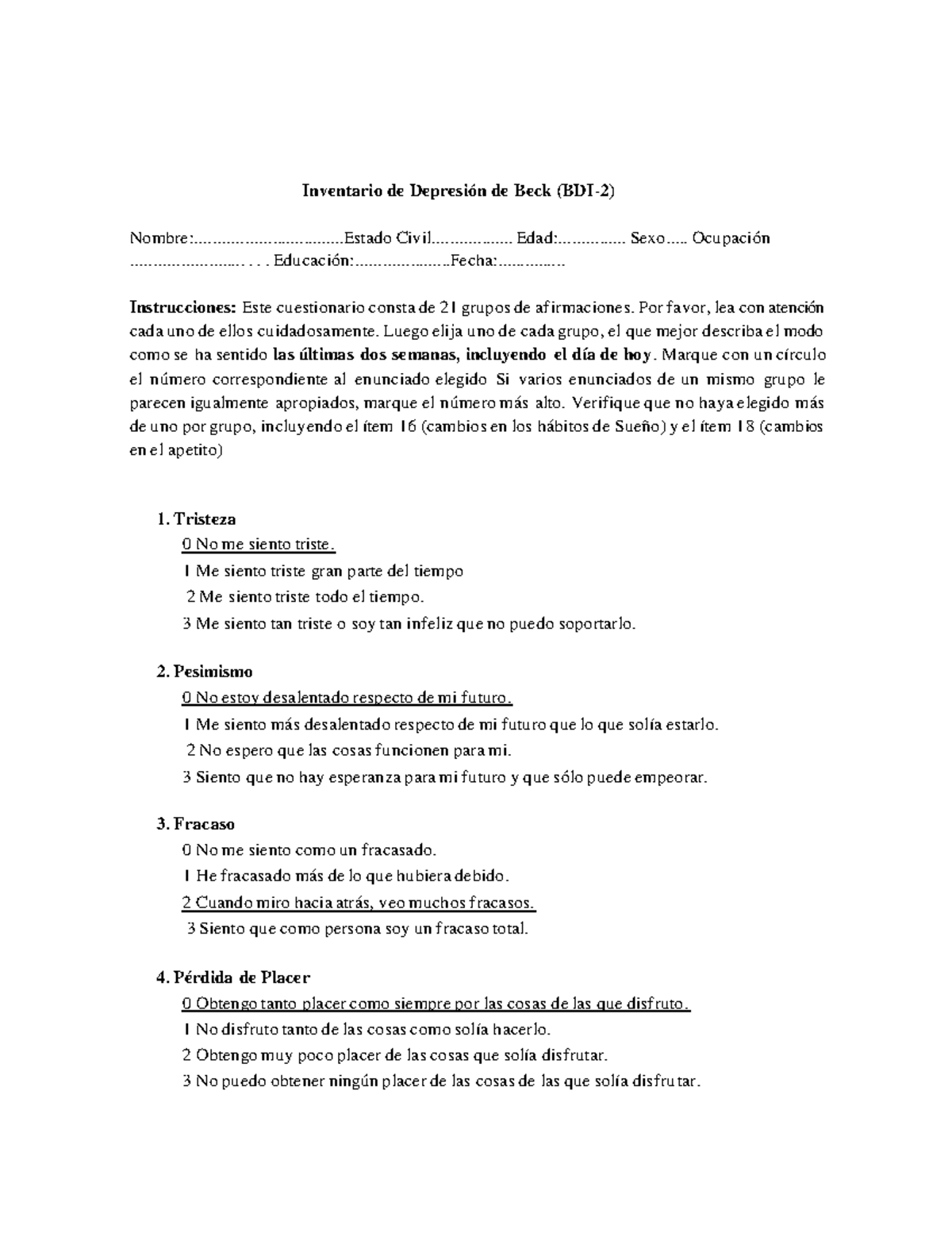 TestInventario de Depresión de Beck protocolo de aplicación 1/ BDI Identificación Studocu