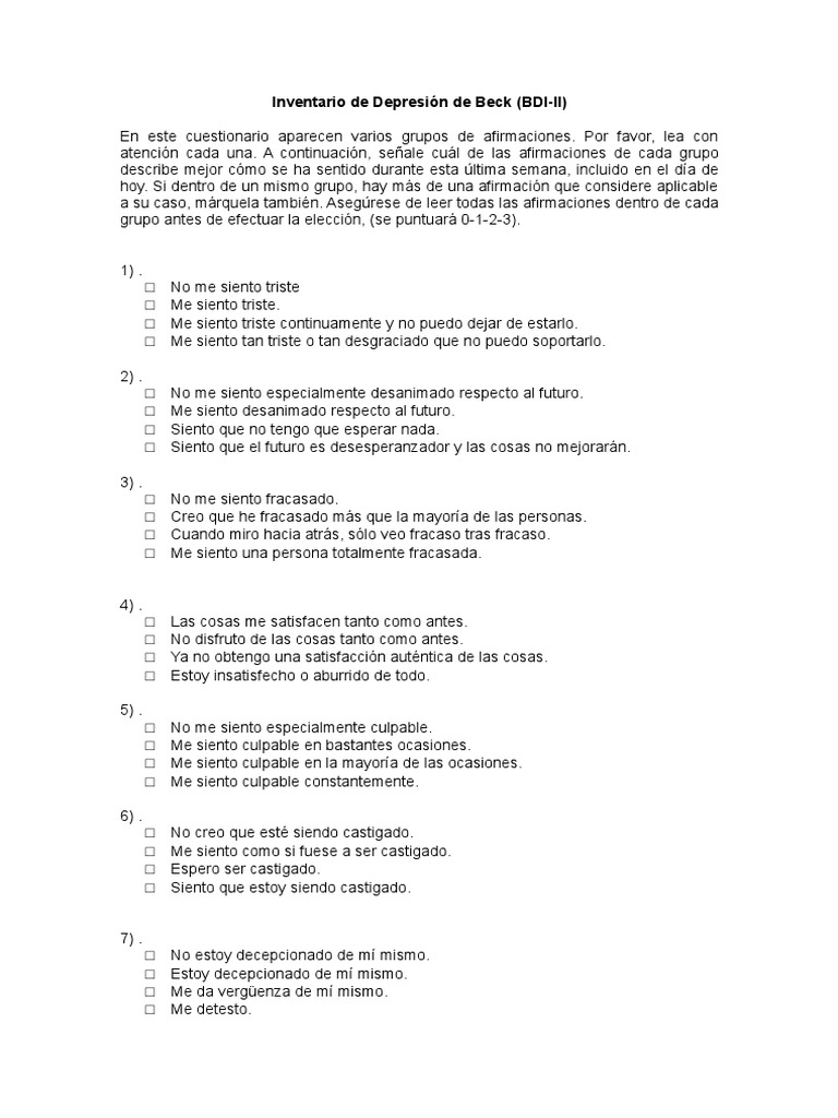 El test de depresión de Beck, también llamado Inventario de depresión de Beck o BDI-II, es uno de los test más utilizados en la actualidad para la depresión, y está formado por 21 ítems con síntomas clínicos de depresión. Fue creado por el psiquiatra Aaron T. Beck hace más de 50 años. Presenta una alta fiabilidad, y permite.